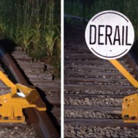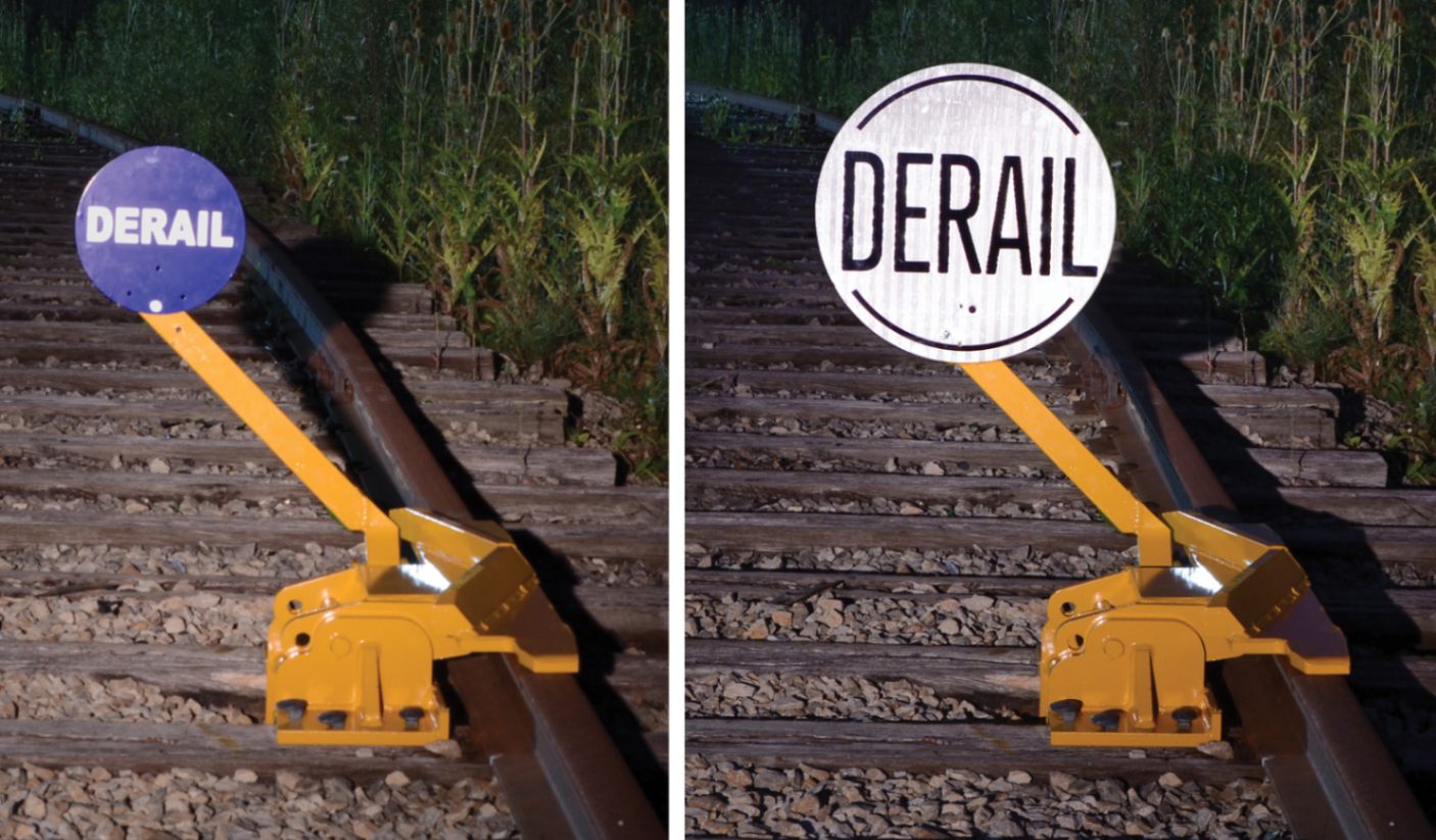 Over three times the size of our usual Blue Derail Sign Plate. It's White and Retro-Reflective with an oversized plate and enlarged DERAIL lettering, allowing for warning at a greater distance than our standard Blue Derail Sign Plate. The enlarged DERAIL lettering is presented on both sides of the plate.