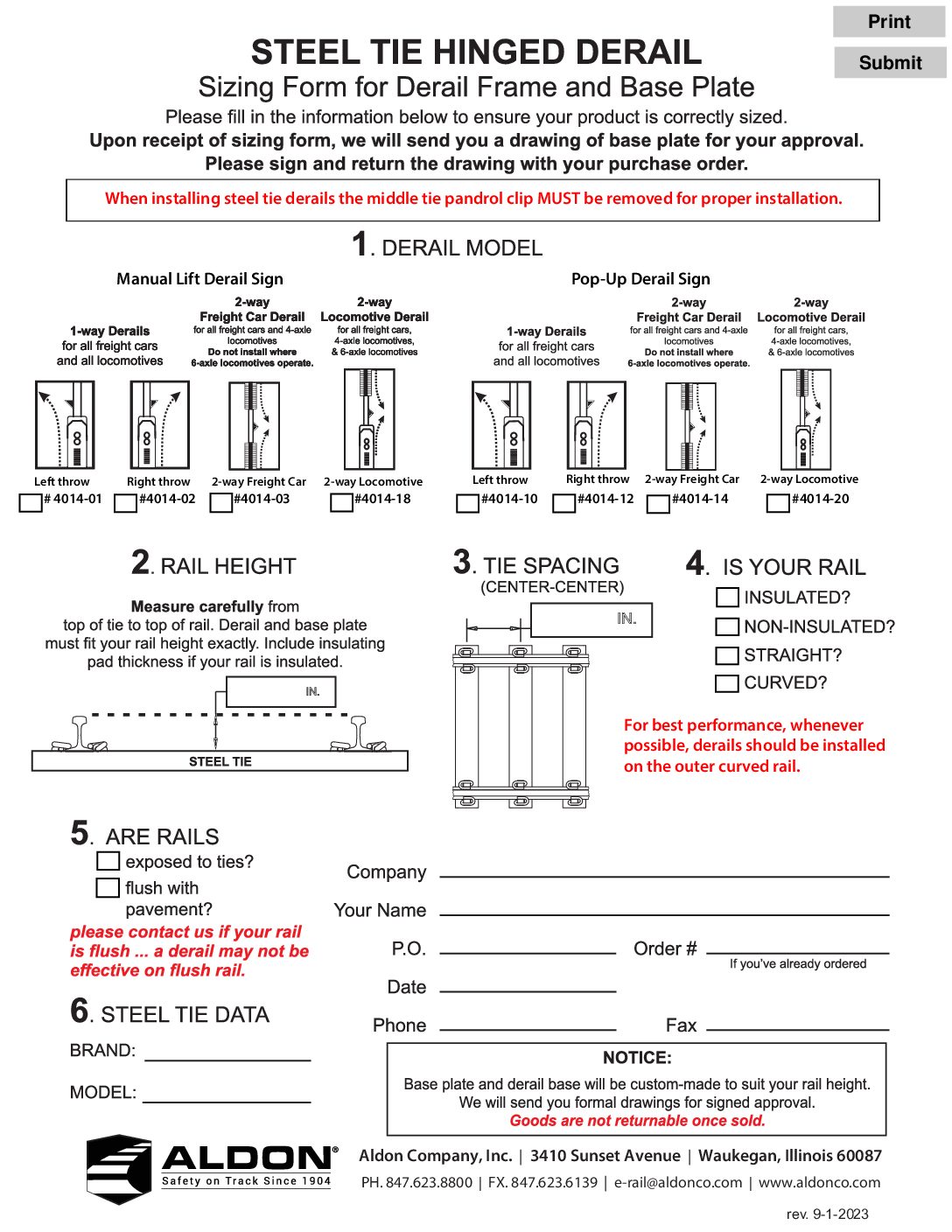 Steel adapter plate, 1" thick, is welded to three steel ties to provide a foundation for bolting One-Way or Two-Way hinged derail. No alteration of the track is necessary. The plate accommodates all types of rail clips. Custom-sized derail is bolted to the plate.