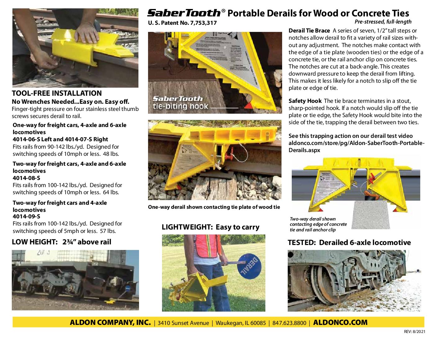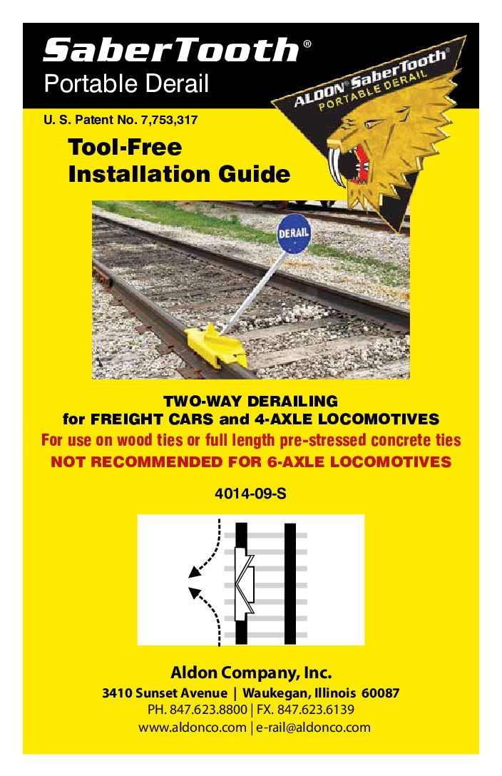 Two-way derail fits rails 90-141 lbs/yd. Tie spacing 19 in -24 in