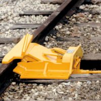 More convenient than a hinged derail. Derail shoe slides in and out of the housing through the leverage of a waist-high operating lever. No need to bend or stoop to activate or deactivate the derail. Work from a comfortable standing position alongside the track.