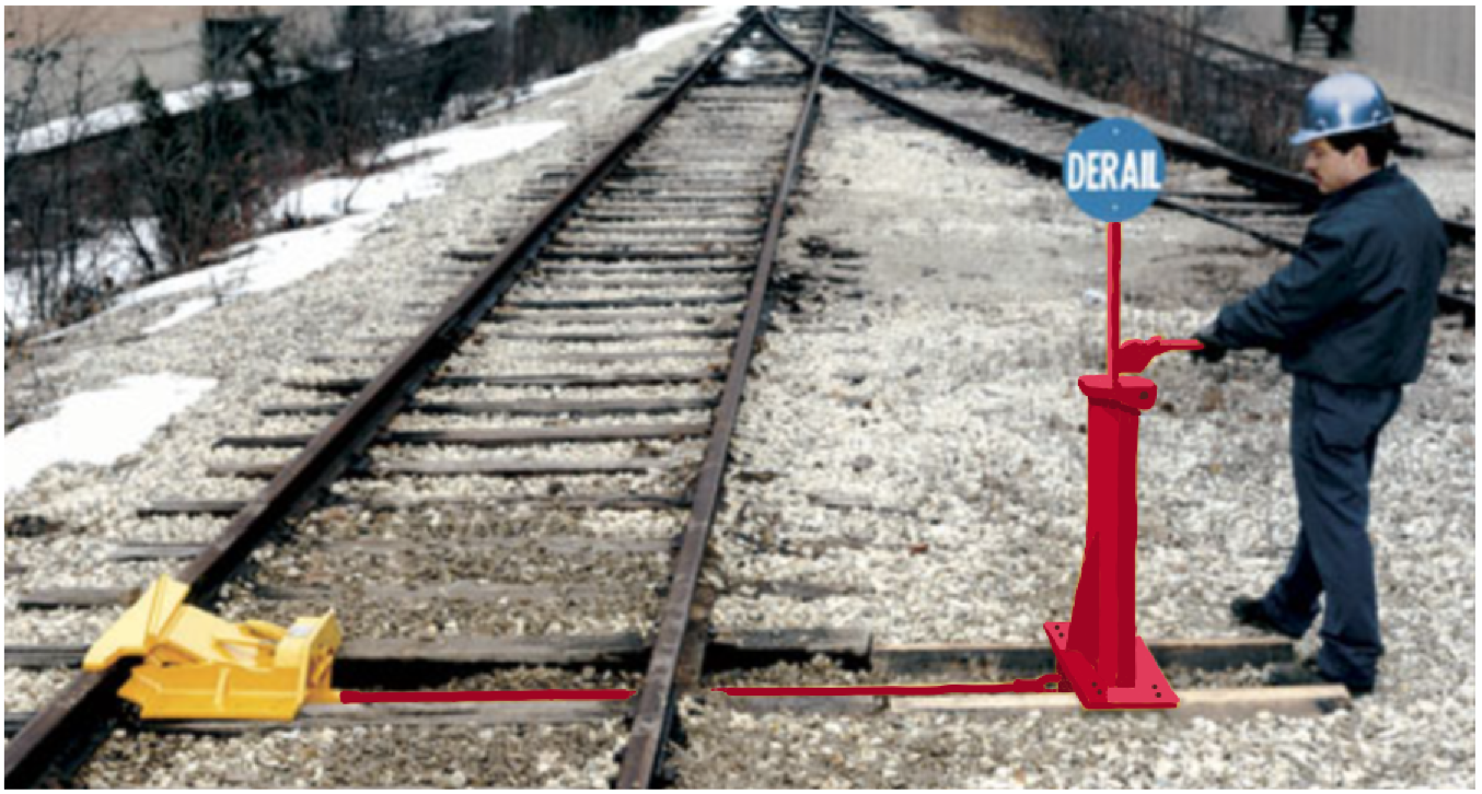 - For freight cars and locomotives. Derail is supplied with a high-rise operating stand, connecting rod, and blue derail sign.
