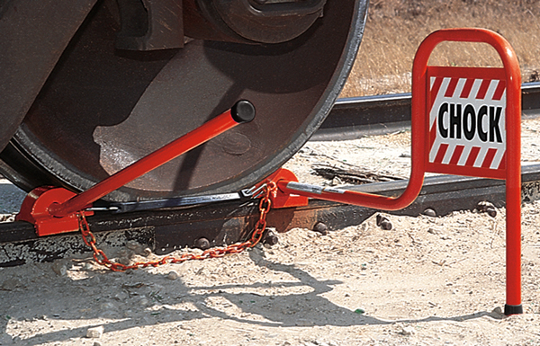 - All steel construction railcar wheel chocks with replaceable rail biting spur for securing freight cars and locomotives.