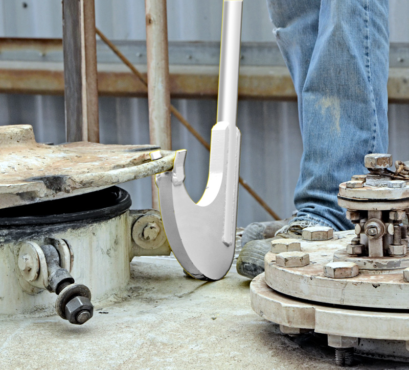 Designed to engage the grab-handle of tank car manway covers. Five-foot aluminum pipe handle and a rocking foot provide the leverage to overcome suction caused by the difference in atmospheric pressure outside the tank car and inside. When using the pry bar, the worker can stand upright and avoid the escaping fumes when the lid pops free.