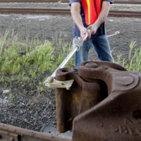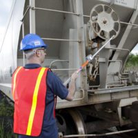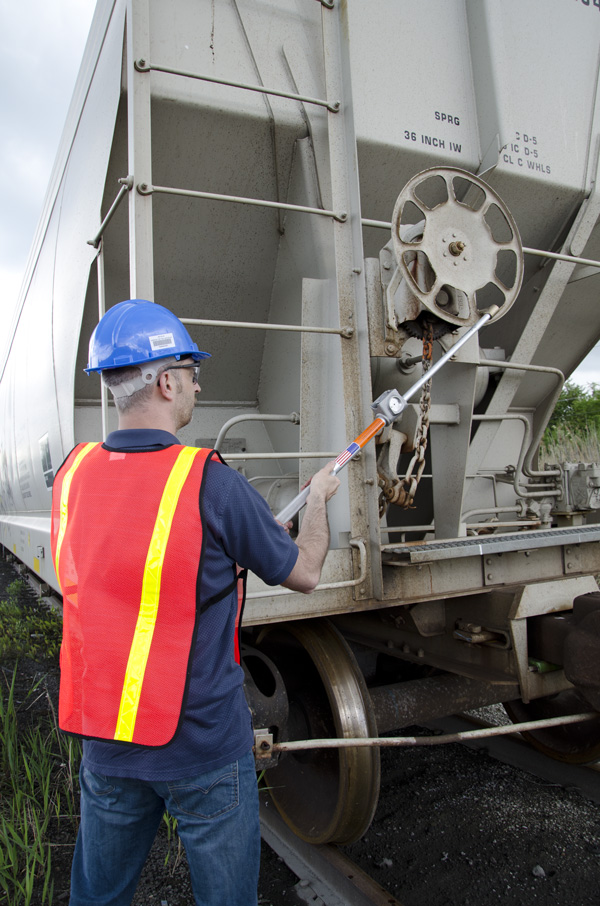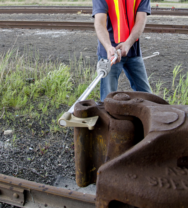 User can tighten and release brakes, align car coupler knuckles, operate angle cocks and reset end-of-train warning devices from a safe distance.