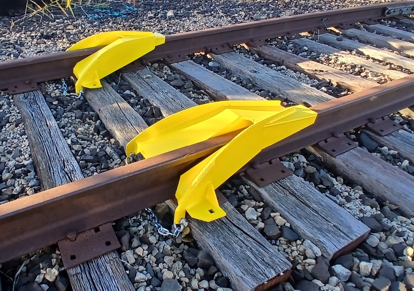 The new lightweight BullFrog Straddle Type Rerailers will rerail any standard size freight car or locomotive. Made from armor-grade steel plates and designed with larger load bearing tie surfaces gives the rerailers extra stability and strength for multiple rerailments. The durable steel plate design makes these rerailers 160 lbs. ligther than a pair of cast steel straddle type rerailers. Each rerailer is equipped with a safety chain and latch hook for safety purposes.