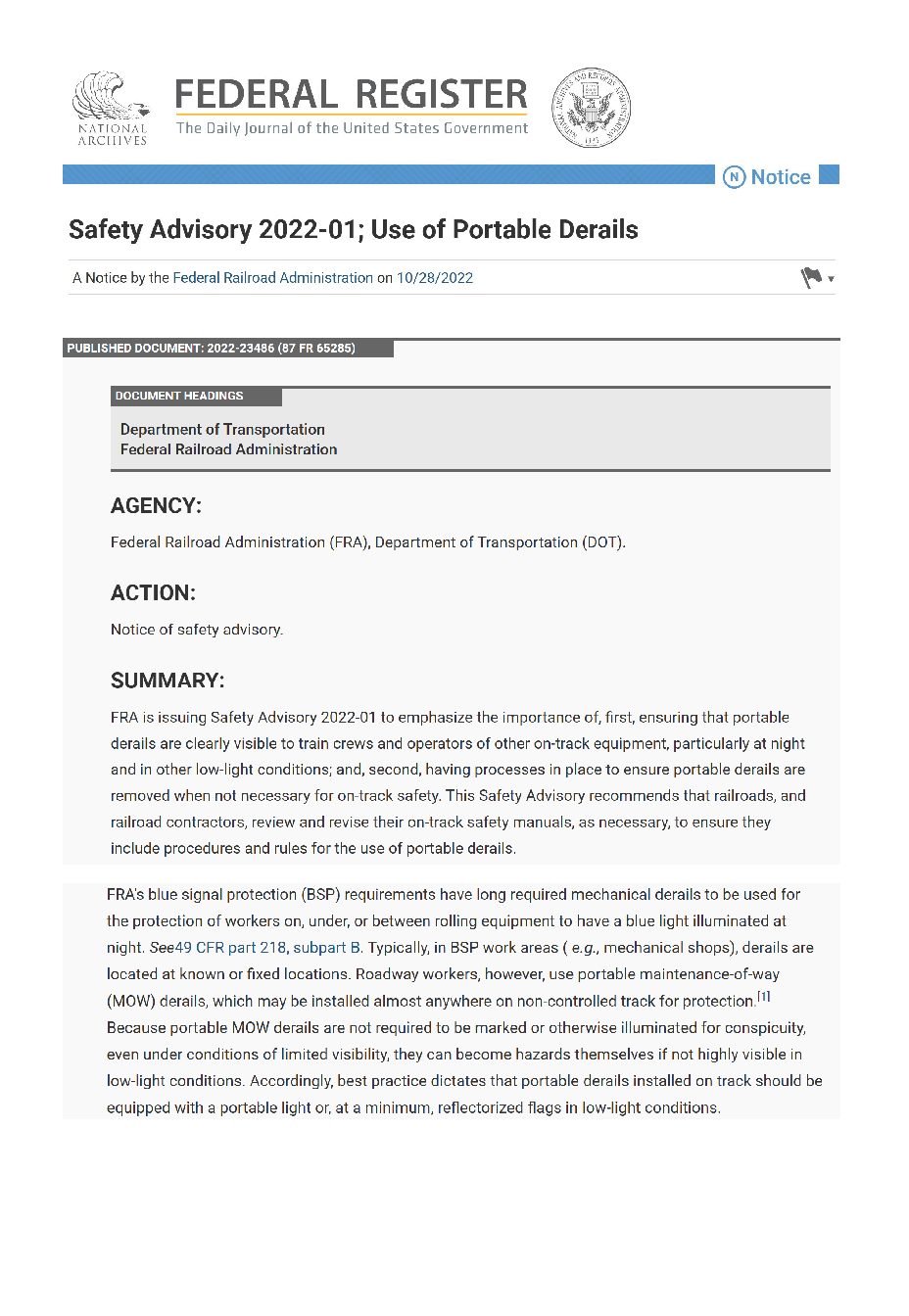 Derail Steering Wheel Tags are used to remind railroad employees and contractors to remove portable derails from the rail after their work is completed. The FRA recommends that railroads advise their employees to place a tag on the steering wheel of railroad equipment for safety reasons. See Safety Advisory below.