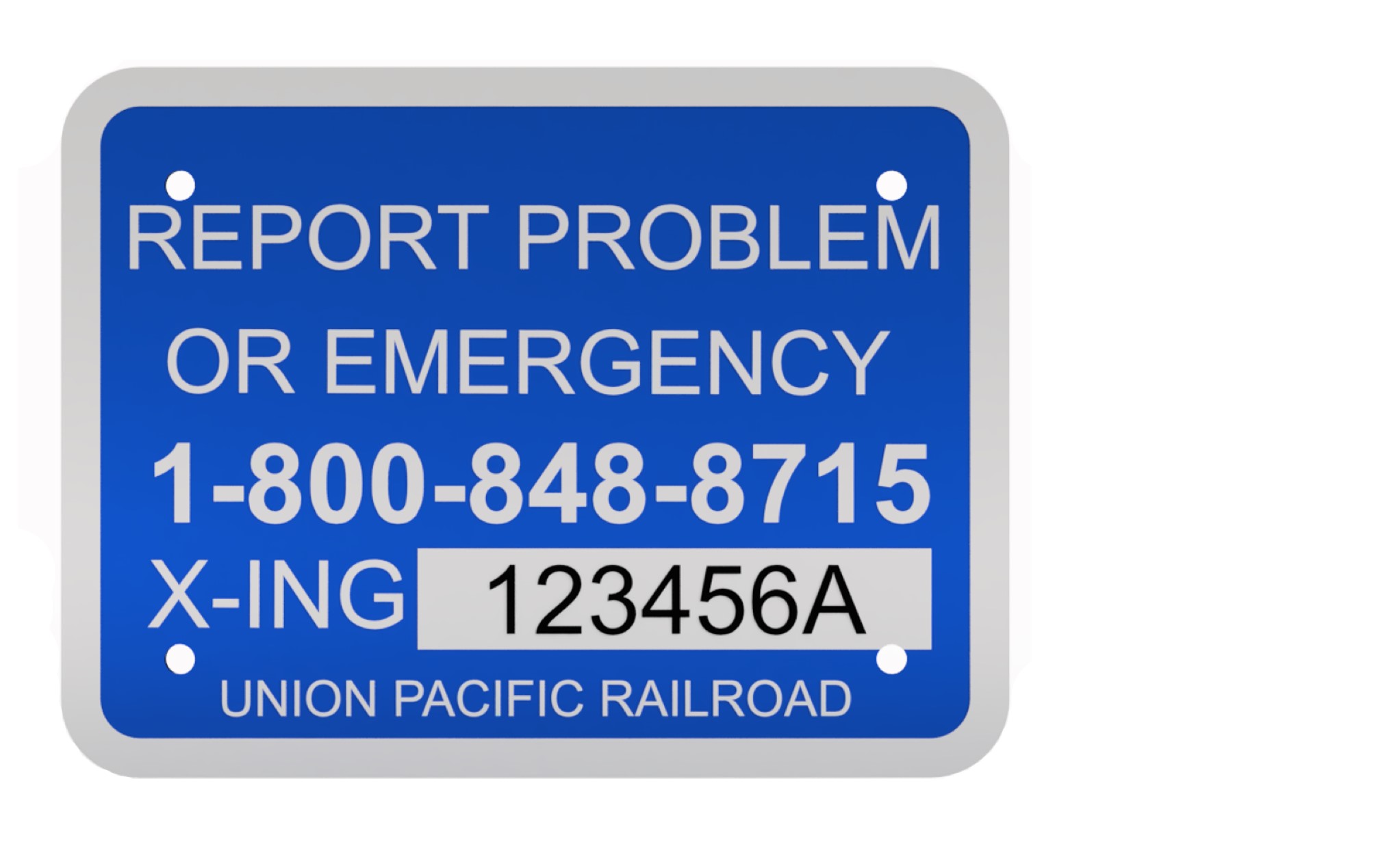 Report Problem Or Emergency Pre-Printed DOT # Sign (Item No. 393-1356) is made to UPRR STD DWG 0520A