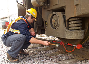 A gust of wind is enough to cause a 260,000-pound freight car to start rolling. Thanks to roller bearings, freight car wheels offer very little resistance to movement. The contact area of each wheel on the rail is smaller that the size of a dime. This is why moving heavy loads by rail is so efficient! But at the same time, all this mass, so easily moved, needs to be securely blocked while the car is being worked.